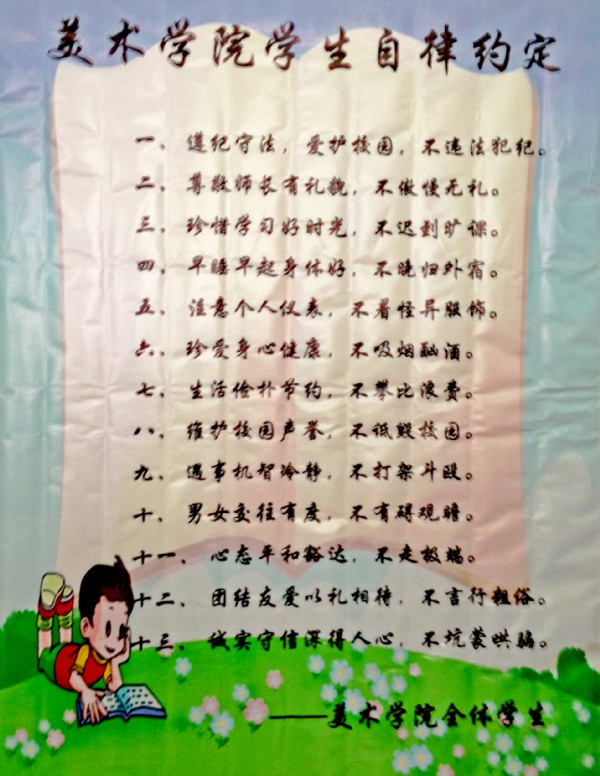 《学生自律约定15条》是经过前期班级学生自主讨论,学生会归纳总结而成,此15条表达了bv1946伟德全体学生立志严格要求自我、不断进取、做一名合格大学生的愿望;是学生追求至善至美的承诺;更是学生积极进取,为建设和谐、文明、向上的分院氛围的体现。